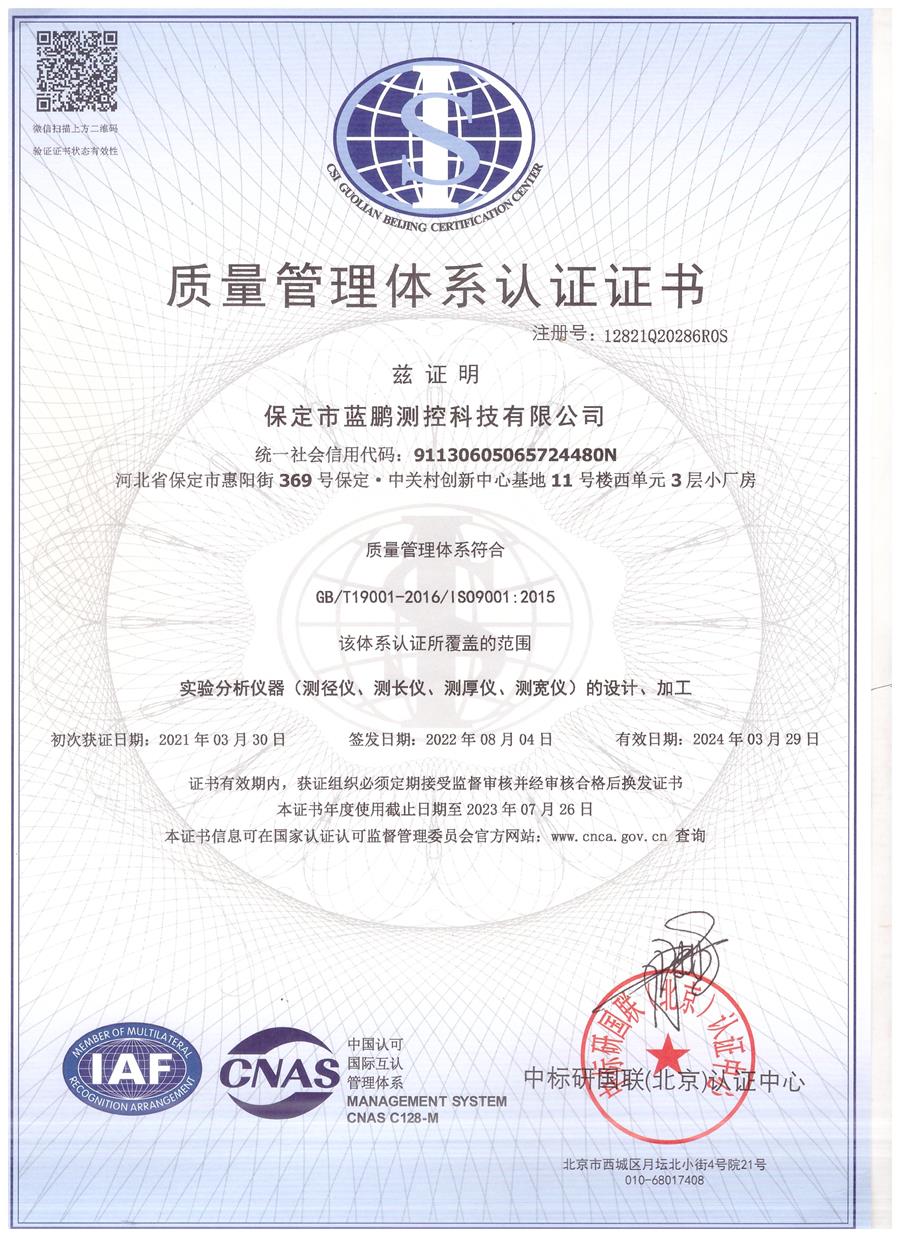 獲得該認證,表明保定市藍鵬測控科技有限公司的質量管理體系符合質量管理體系及相關要求,是對公司作為儀器設計加工商的認可,這有利于進一步提升公司的綜合競爭力,為公司在儀器相關市場奠定了良好的基礎。