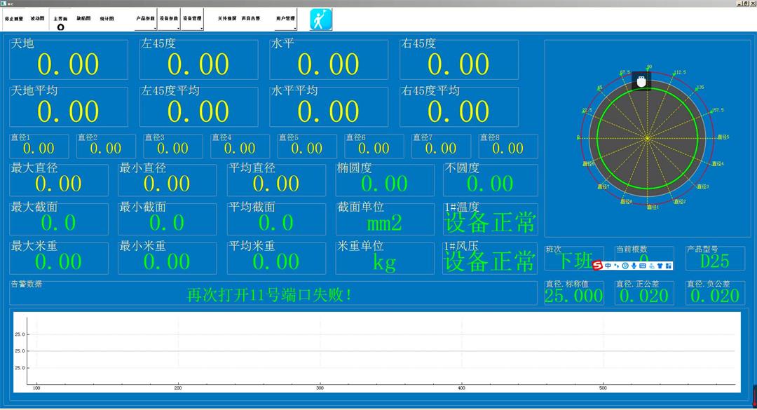 實時顯示天地、水平、左右45度測量值(相鄰3路的平均值)、不圓度(60.8顯示天地減水平取相對值)及整根軋材的累計平均值。